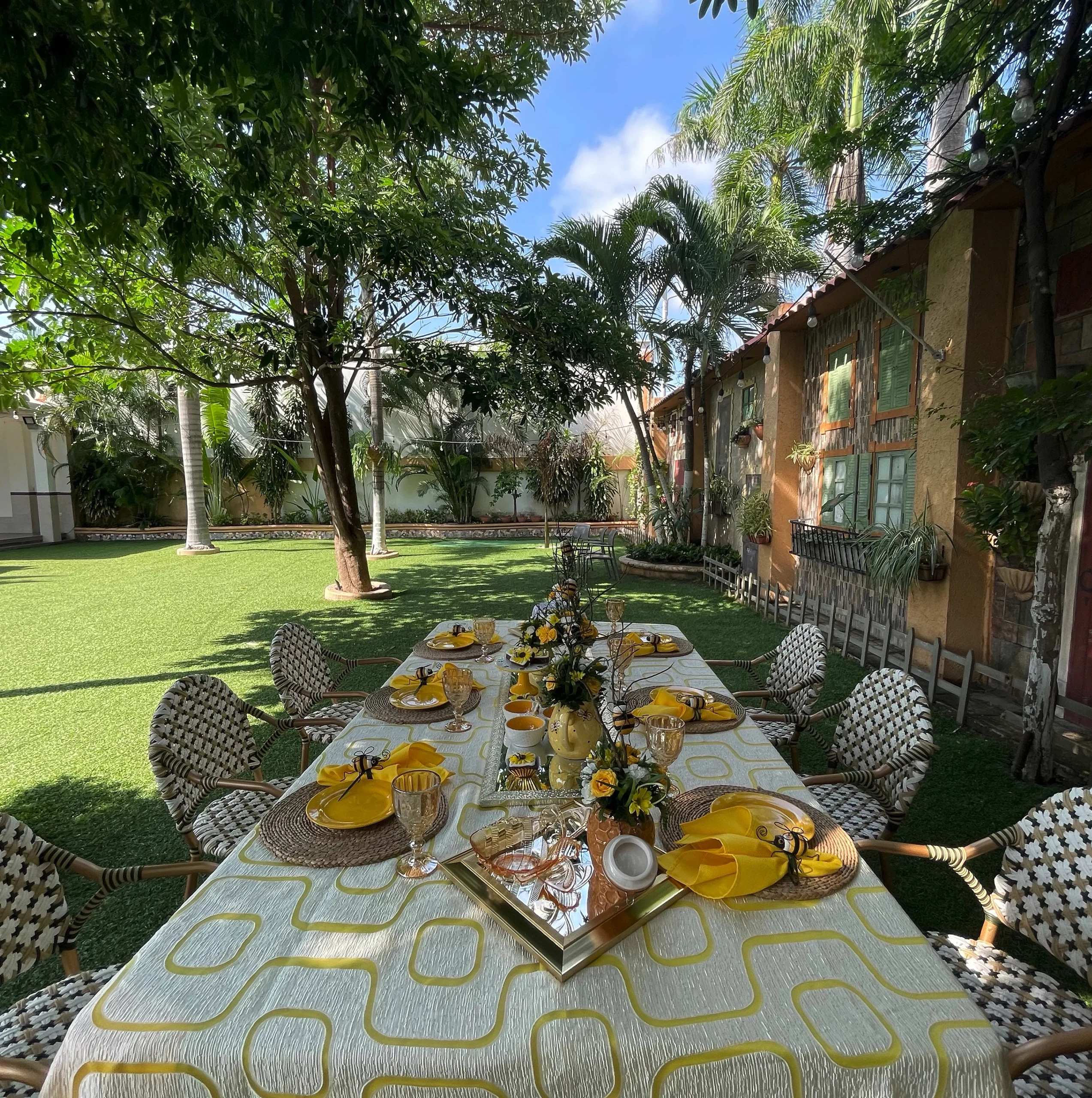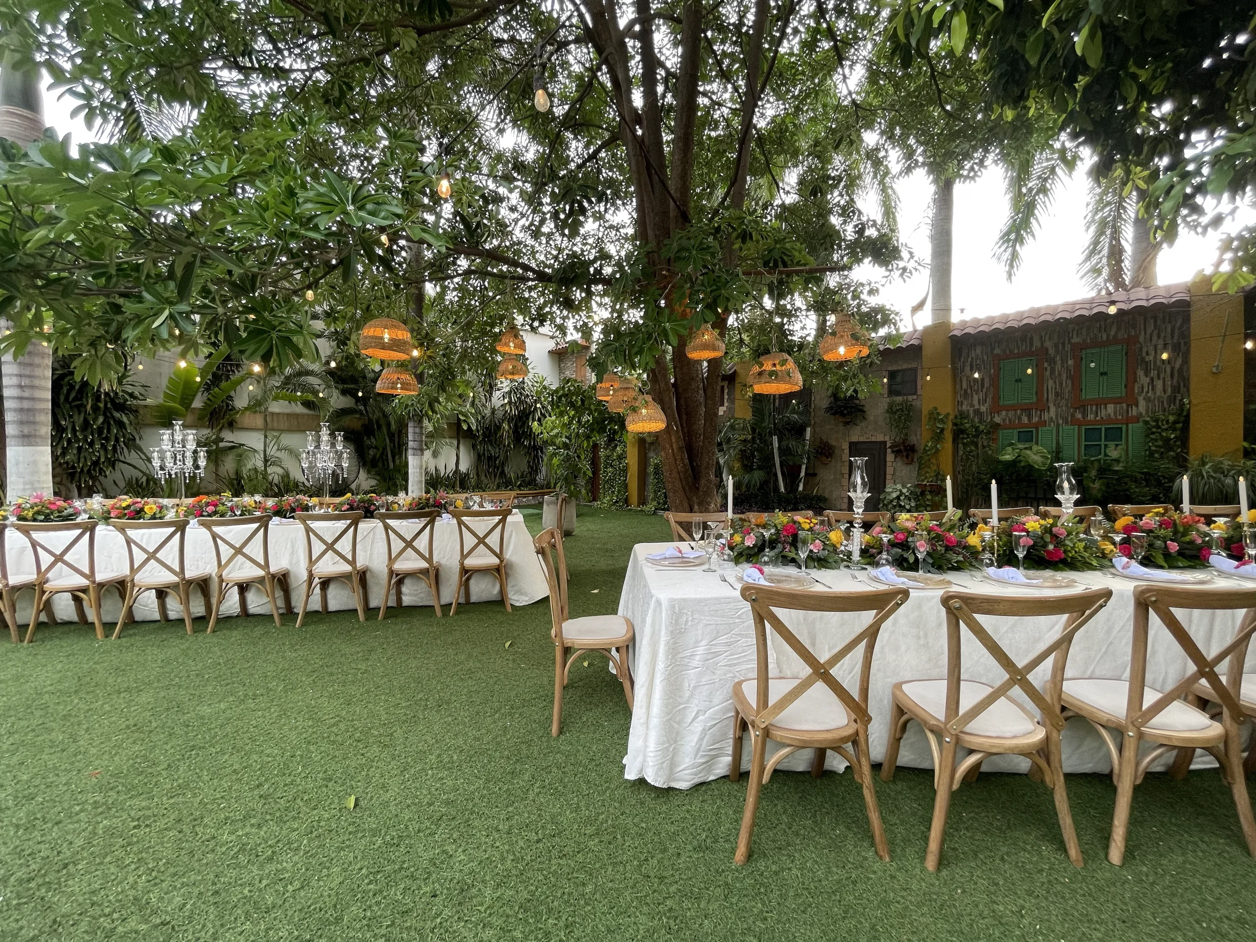 Montaje en mesas y mantelería Servicio de agua Sillas crossback Servicio de meseros 3 cilindros y arco (sin decorar) 6 horas de evento Puesto del homenajeado
